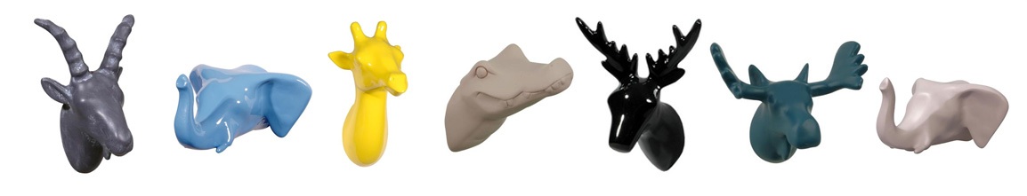 Wandhaken in de vorm van een nijlpaard, een krokodil, een olifant, een geit of een ander dier. De wandhaken zijn verkrijgbaar in verschillende kleuren zoals bijvoorbeeld koper, wit, cement, aqua, roze of rood. Het is erg leuk om de wandhaken te combineren en zo zelf een grotere kapstok te creƫren. Hang ze allemaal naast elkaar of ga juist voor een speels effect door ze op verschillende hoogtes te hangen.